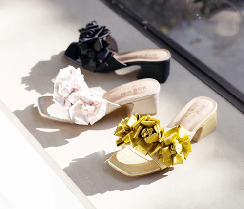 HANAE MORIらしい立体的なフラワーフリルを大胆にあしらったミュール。光沢感のある生地を重ねたボリューミーなフリルが、足元にフェミニンな華やぎをプラスします。スクエアトゥの程よいモード感が甘さを引き締め、洗練された印象に。ブラックはフリルの立体感を際立たせつつシックな雰囲気に、アイボリーは女性らしさを引き立て、軽やかな足元を演出。イエローはアクセントカラーとして存在感を添えるカラーです。デニムやリゾートワンピースなど、夏の装いを引き立てる主役級の一足。