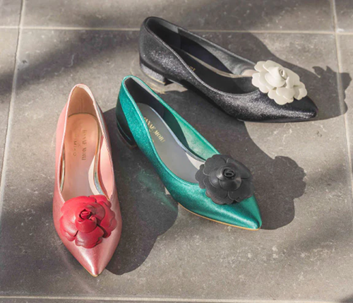 HANAE MORIを象徴するフラワーモチーフが主役の、フラットながら華やかさを備えたパンプス。サテンの上品な光沢と、卑弥呼ならではのすっきりとしたシルエットが足元を美しく演出します。フラワーモチーフは取り外し可能な2WAY仕様。モチーフを付ければ装いの主役になる華やかな表情に、外せばプレーンパンプスへと変化し、シーンに合わせた履きこなしが楽しめます。 ブラックは落ち着きのある端正な印象に、ピンクは装いにやさしい甘さを添え、グリーンはアクセントカラーとしてコーディネートを引き締めます。