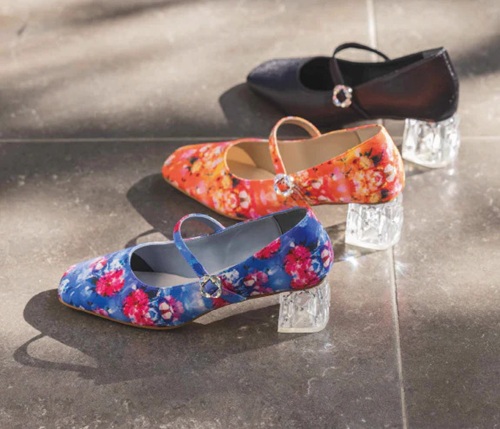 HANAE MORIの世界観を象徴するフラワーモチーフを、HIMIKOならではの洗練されたフォルムに落とし込んだ特別感あふれるコラボレーションパンプス。ストラップには繊細に輝くフラワービジューバックルをあしらい、安定感のある履き心地も魅力です。ヒールにはキルティング風のクリアヒールを採用し、ラインストーンが光を受けてさりげなくきらめく印象的な後ろ姿に。オレンジとブルーの柄には、HANAEMORI 2026SSコレクションのグラフィックを使用した特別感のあるデザイン。足元が主役になる、コレクション性の高い一足です。