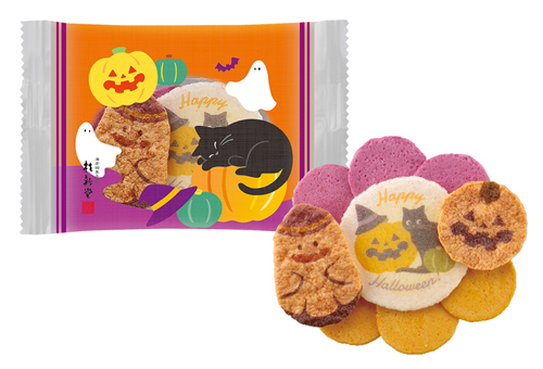 かわいらしいおばけを描いたえびせんべい。プチギフトやハロウィンのお菓子にぴったりです。