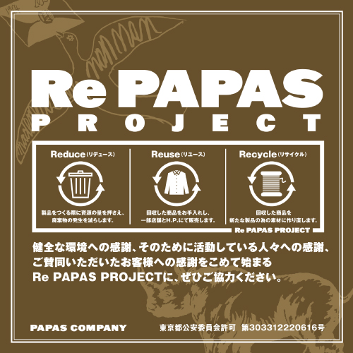 お客様からご愛用いただいた〈マドモアゼルノンノン〉〈パパス〉の商品をお持ち込みいただき、それらをリユース、もしくは再生して新しい製品のための素材にリサイクルします。健全な環境への感謝、そのために活動している人々への感謝、ご賛同いただいたお客様への感謝をこめて始まる〈パパス〉〈マドモアゼルノンノン〉のリサイクル活動にご協力ください。