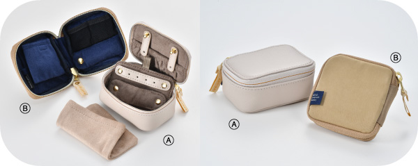 こだわりのコスメツールを作り続けるARTISAN&ARTISTとのコラボ商品。スムースな手触りの生地を使用した優しい風合いのアクセサリーポーチです。用途に合わせた収納スペースに分かれており、アクセサリーをコンパクトに持ち運ぶことができます。