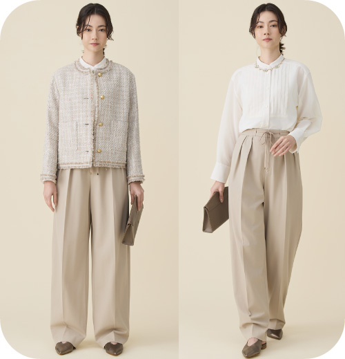 ハレの日にちょうどいい華やかさを添えるリボンブラウス。ジャケットは、羽織るだけで全体がすっと整うテントラインシルエット。特別な日にも、日常にも馴染む「きれいめ好印象Style」です。