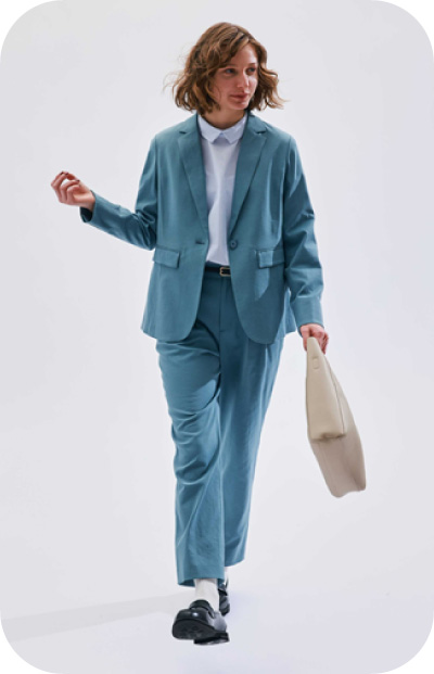 フィロソフィー定番のドライオックスフォードシリーズ。ジャケットはキレイ目なステッチ使いのシングルテーラードジャケット。ナチュラルな素材感でありながら、吸水速乾性・接触冷感性・UVカット性・透け防性のある多機能素材です。パンツは、すっきりとしたデザインのキレイ目ワイドストレートスラックス。従来のモデルより着丈を2cm長くし、ブラッシュアップしています。