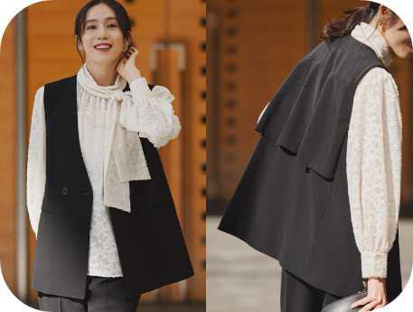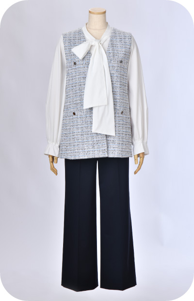 華やかなミックスツイードのジレとボウタイブラウスがセットになった「いまどきハレの日スタイル」が時短でかなうアイテムです。「ハレの日」のイベントシーンでは、キレイめボトムとスタイリング。デイリーにはデニムに合わせてと着回し力の高いアイテムです。