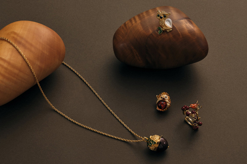 秋の森で出会う可愛らしい動物など遊び心たっぷりのモチーフコレクション。白蝶貝の翼が艶めくフクロウと、琥珀のどんぐりを抱えたハリネズミのブローチ。赤いベリーの木にやってきたコマドリのイヤーカフや、帽子を開閉できるどんぐりのロケットネックレスなど熟年の職人がひとつひとつ丁寧に仕上げたこだわりのアイテムです。