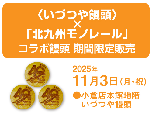 北九州市民の足として親しまれる「北九州モノレール」と「いづつや饅頭」のコラボ饅頭を企救丘車両基地で行われる「モノレールまつり2025」当日の11月3日(月・祝) 限定で販売いたします。