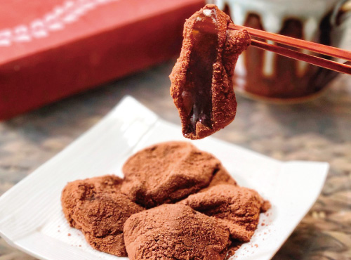 甘さと苦味が絶妙なチョコきな粉の中には、もっちりとろける黒糖わらび餅。ビターな大人のお味をどうぞ。