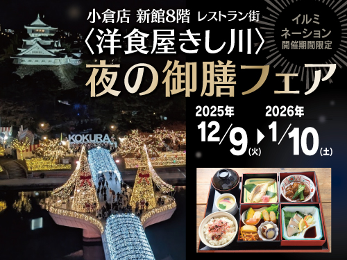 〈洋食屋きし川〉では小倉イルミネーション開催中に特別メニューをお楽しみいただけます。夜だけの限定御膳や定番の御膳にも茶碗蒸しをサービス致します。ぜひこの期間中に小倉イルミネーション見下ろす窓側席でお楽しみください。