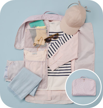 お洋服をハンガーごと収納できる機能的なアイテムで、泊りがけの旅行にも重宝します。ポケットも複数備えており、ハンカチや靴下など小物もスマートに収納できます。