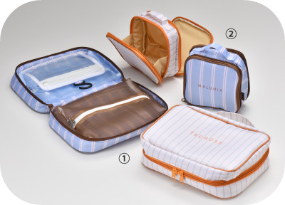 スタンド型でリップやスプレーなど入れやすい形。裏面は大きく開くので予備のハンカチなどマルチにお使いいただけます。