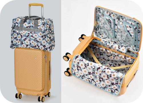 コンパクトに収納でき、荷物が増えた時のサブバッグにも便利なポケッタブルボストンバッグ。内側には吊りポケット、外側にはファスナーポケット・サイドポケットがあり、HaNTのスーツケースの内装とお揃いの柄です。