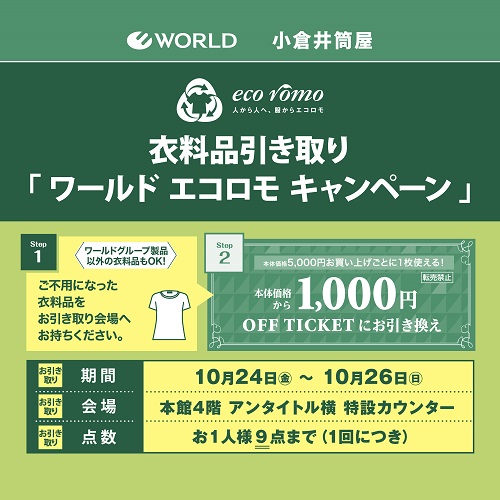 ご不用になった衣料品を1点につき「エコロモ1,000円OFFチケット」一枚とお引換え。チケットは小倉井筒屋の下記対象ショップにてご利用いただけます。