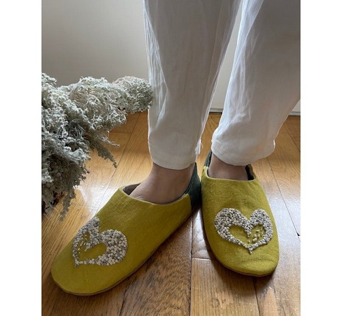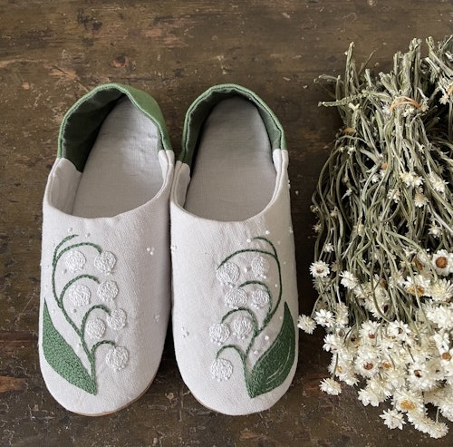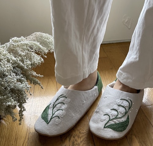 北海道の動植物をモチーフに手刺繍をしたルームシューズ。ご家庭の洗濯機で丸洗い出来るのでいつも清潔にお使いいただけます。踵を踏んでスリッパの様に履けますが、踵をグイッと入れて履くと歩行時に脱げる事なく、安全にお使いいただけます。