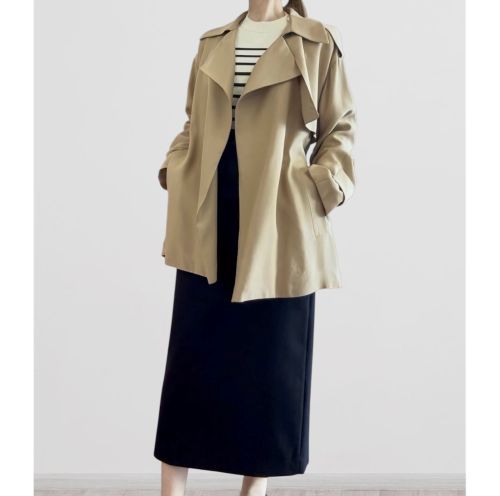 なだらかなショルダーラインが生み出す柔らかなニュアンスのトレンチコート。ラップ仕様のややAラインのシルエットで軽やかに羽織れるおすすめの一枚です。ウエストのベルトをきゅっと結べば、女性らしいメリハリもプラスできます。