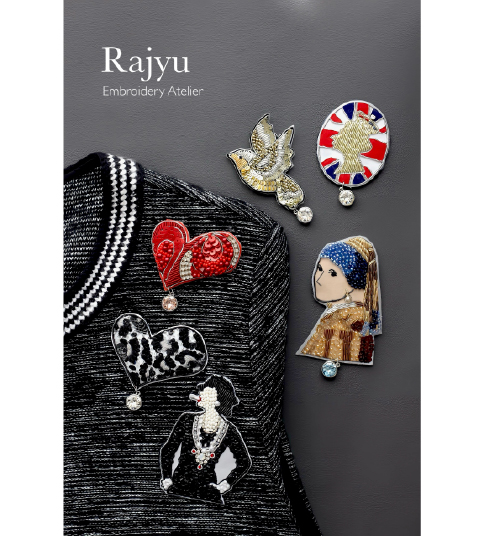 絵画からインスピレーションを受けたデザインを、職人が繊細な刺繍で表現するブランド〈ラジュー〉。手刺繍のブローチ、アート、スカーフ留めなどをはじめ、マグネット式の留め具を使用したシルクスカーフや、色鮮やかな刺繍ストールなど多数取り揃えております。