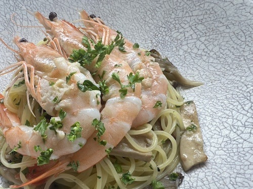 半生で火を入れ、海老の甘みを引き出し、ソースには北海道産の昆布出汁と海老ミソの旨みがパスタに絡んだ最高の一皿です。是非ご賞味くださいませ。