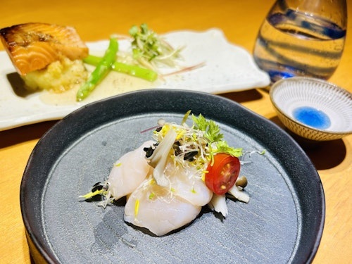 北海道の名産品、地酒にこだわったペアリングセットです。日本酒は北海道銘酒「男山」1合で北海道産ホタテと鮭に合わせております。この機会に北海道を味わってくださいませ。
