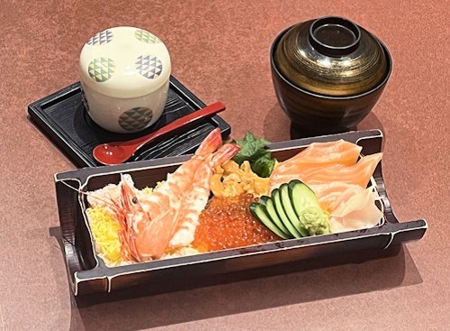カニ・ウニ・いくら・海老・サーモンをこだわりのシャリの上に贅沢に乗せた逸品です。お子様から大人の方まで幅広くご賞味いただけるちらし寿司をぜひご堪能くださいませ。
