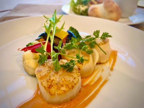 貴重な肉厚の北海道産ホタテを軽くソテーし風味を閉じ込めました。温野菜とともにホタテの旨味をじっくりお楽しみくださいませ。