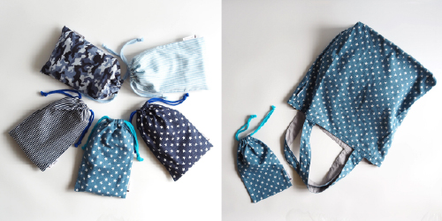 トートバッグの表地と同素材でできた巾着に、バッグを畳んで収納できます。