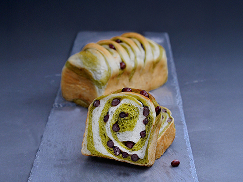 抹茶香る生地と生クリームとバターを使用したソフトな生地で大納言かのこを巻き込み、マーブル模様に焼きあげました。