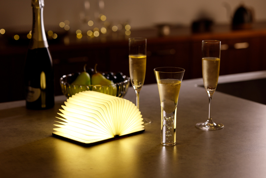 スタイリッシュな本のデザインのライトとバブルシリーズのシャンパングラスで特別な日のテーブルを華やかに演出します。