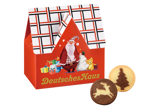 バターたっぷりさくさくビスケットを個包装して、ハウス型の箱に詰めました。トナカイ、ツリーのかわいらしいシルエット模様が入っています。