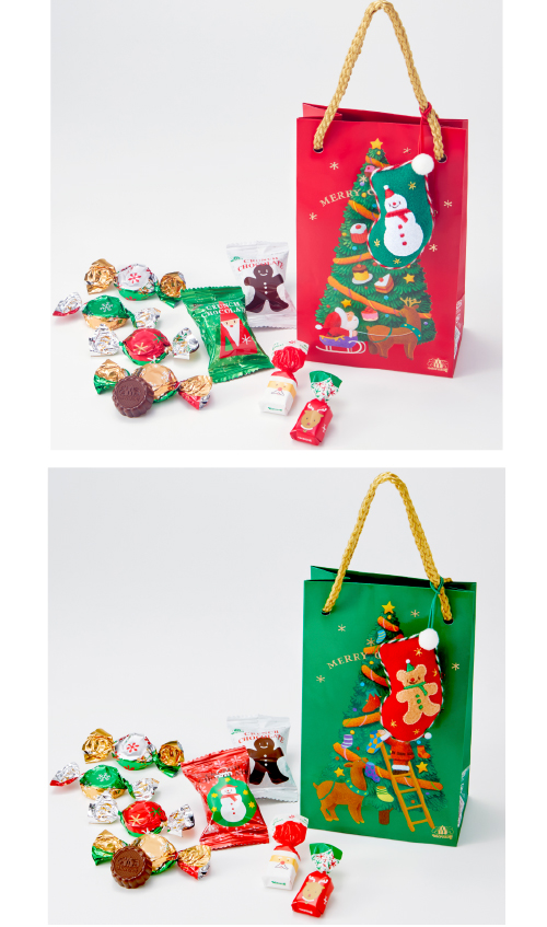 ミルクチョコレートとクランチチョコレートをキュートなクリスマスデザインのバッグに詰め合わせました。クリスマスベアとスノーマンのブーツ型マスコットがポイントです。