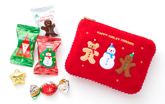 クリスマスベア、スノーマン、ジンジャーマンのかわいいアップリケをつけた刺繍入りポーチに、ミルクチョコレートとクランチチョコレートを詰め合わせました。