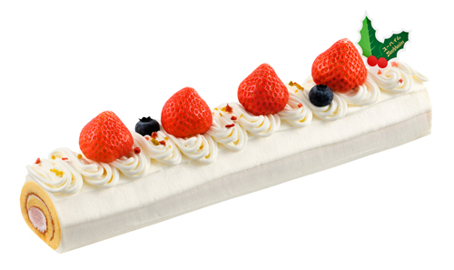 ふわふわのスポンジでベリームースと生クリームを巻き込んだロールケーキ。たっぷりの生クリームに、フレッシュな苺とブルーベリーを飾りました。