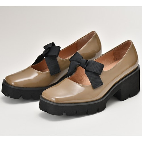リボンが可愛らしい上品なパンプスの新色カーキは、井筒屋先行販売。光沢のあるエナメルの素材なので、エレガントな装いにもぴったりです。つま先はゆるやかなスクエア型でスタイルアップの効果も。6cmヒールに2.5cmのプラットフォーム付きなので安定感も抜群です。