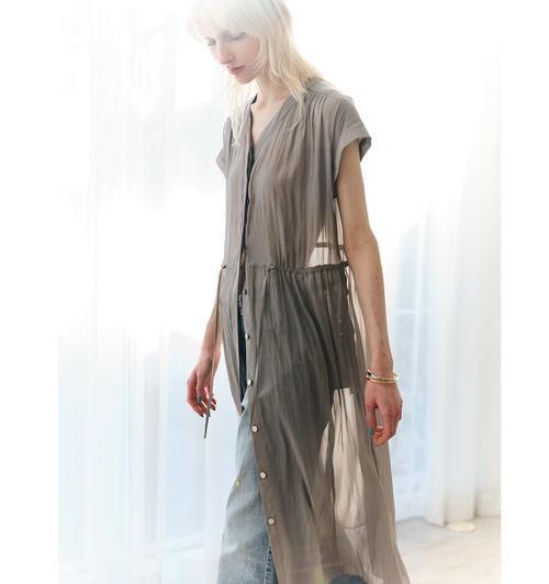 柔らかな質感と薄いシルクのような風合いをもつカッセンシフォンオーガンジー。カッコよく前を開けて羽織として着ても良い着回しのきくワンピースです。同素材のリバーシブルパンツ、スカート、ブラウスもご用意しております。