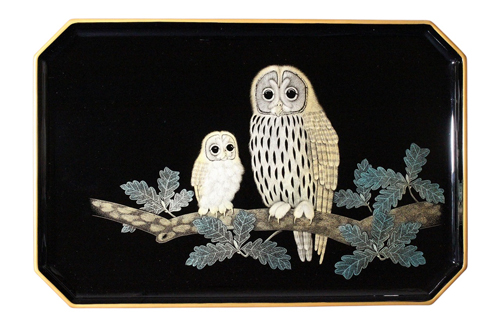 西 勝廣作 飾皿 沈金「親子ふくろう」