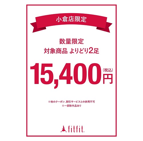 フィットフィットでは、本館8階レストラン街特設会場にて2足よりどり15,400円のスペシャルセールを開催いたします。定番のスニーカーやパンプス、これから活躍するブーツなど選りすぐりのアイテムを期間限定価格にてご奉仕いたします。ぜひこの機会にフィットフィットのシューズをお試しくださいませ。(その他のクーポン、値引きとは併用不可です。)