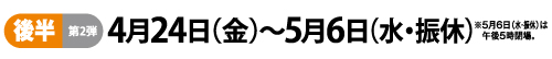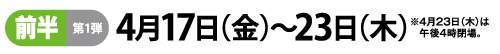 【前半】2026年4月17日(金)〜23日(木) ※最終日は午後4時閉場【後半】2026年4月24日(金)〜5月6日(水・振休) ※最終日は午後5時閉場