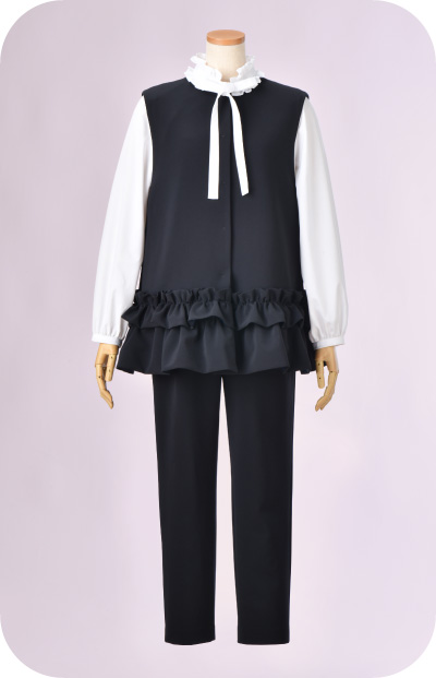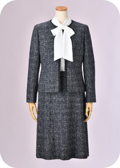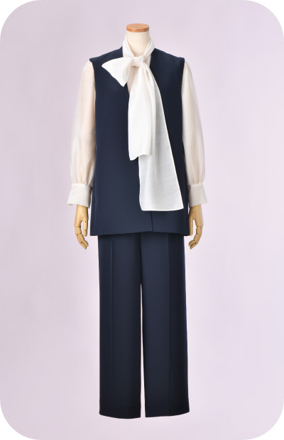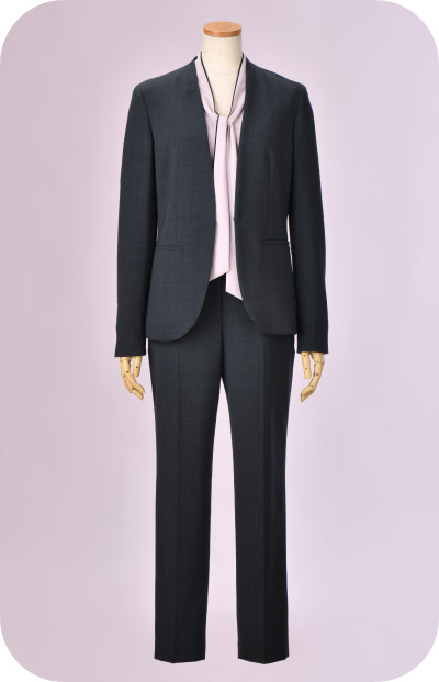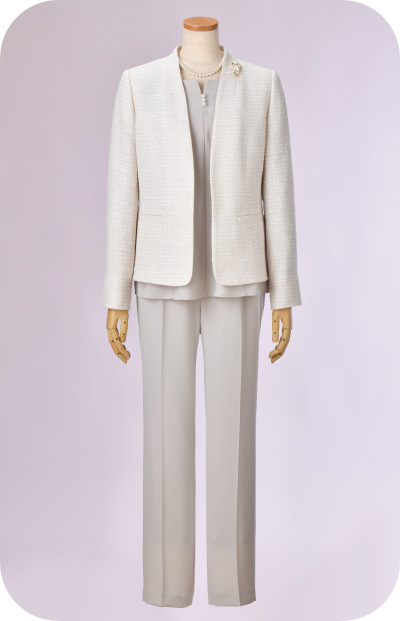 ツイードジャケットに無地のブラウスとパンツがセットになった、フォーマル感のあるパンツスーツ。ブラウスとパンツでもきちんと感が出るよう、パールボタンをキーカラーに付けました。