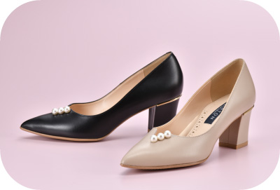 やや大ぶりのパールが目を惹く上品でフェミニンなパンプス。Vカットの履き口が甲をすっきりキレイに見せてくれるのも嬉しいポイント。6cmのヒール高でも太目のヒールで安定感とスタイルアップが叶う一足です。