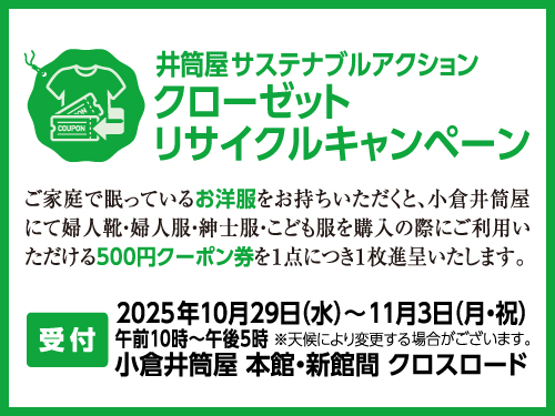 ご家庭で眠っているお洋服をお持ちいただくと、小倉井筒屋にて婦人靴・婦人服・紳士服・こども服を購入時にご利用いただける500円クーポン券を1点につき1枚進呈いたします。
