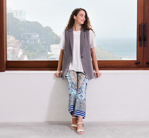 ノッチドラペルのすっきりとしたジレにマリンブルーが印象的なペイズリープリントのパンツを合わせて。端正なテーラードが柄の存在を引き立てる、今年らしい新鮮な着こなしをご提案いたします。