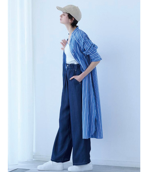 デニム見えシャンブレー素材で仕立てた、きれいめワイドパンツ。ウエストは総ゴム仕様で快適ながら、腰位置を高く見せるハイウエストデザインで、スタイルアップ効果抜群!カットソーからブラウスまで幅広く合わせやすく、大人のカジュアルスタイルにぴったりの逸品です。