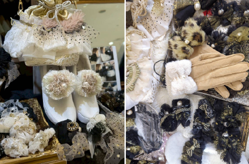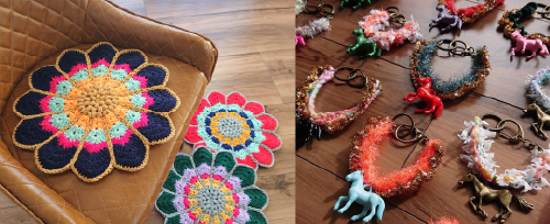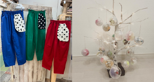 色や柄の組み合わせを楽しみながらカラフルなアイテムを手作りしています。今シーズンはファーやボアを使ったネックウォーマーが人気です。