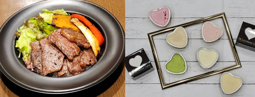 丼グランプリ優勝 和牛ステーキ丼をお楽しみください。ハート型のチーズケーキもあります。