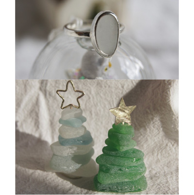 海で集めたシーグラスや貝殻のアクセサリー。自然が生み出した素材の色や形を生かし、ひとつひとつ丁寧に作っています。今回はクリスマスに合わせて、小さなオブジェもご用意します。