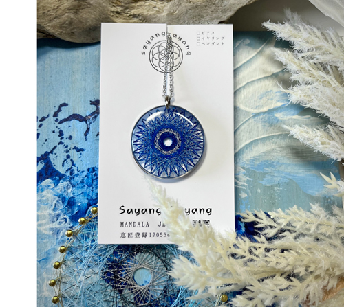 糸かけ曼荼羅の技法で1つ1つ丁寧に糸を掛けて作った、〈sayang sayang(サヤンサヤン)〉オリジナルのペンダント。深いブルーの糸が描く美しい模様は、心を静かに整えてくれるような存在です。特許庁に意匠登録(第1705368 号)。