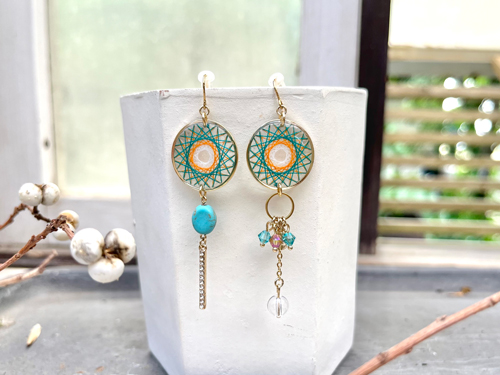 1 つ1 つ糸をかけて作った糸かけ曼荼羅のアクセサリー。耳飾りの中でも人気のサイズ。