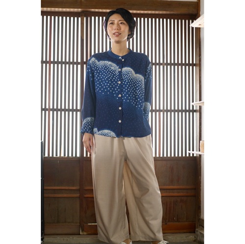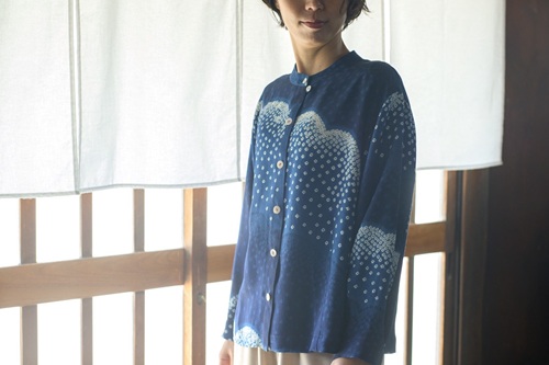 柔らかな縮緬絹の藍染め絞りをブラウスに仕立てました。肌触りよく軽やかな絹素材は一年を通して楽しんでいただける優れた布といえます。ストレスから解放されて旅行やお食事会にお出かけしませんか。