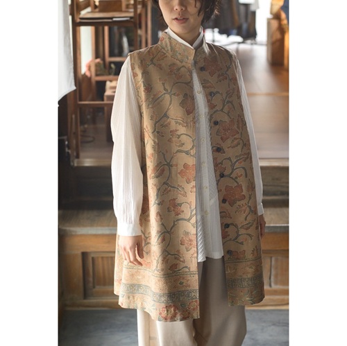 手描きろうけつ染の生地は染料も草木によるもので希少価値のある作品です。優しいピンクベージュを基調としたロングベストは春のお出かけを素敵に演出してくれる必須アイテムです。