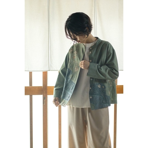 藍染めコットンに花柄刺し子の作品です。男性仕様の場合は藍染め地刺し子と藍染め膨れ織の布を多めに花刺し子を少なめに配分しパッチワークしました。女性仕様の場合は全体に花を刺し子した味わいのある作品にしました。