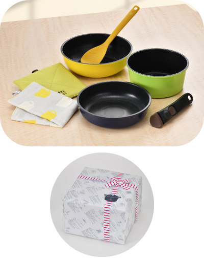 セット内容:本体/18cm(グリーン):(約)径19×高さ8.4cm、20cm (ネイビー):(約)径21.3×高さ5.2cm、22cm (イエロー):(約)径23.3×高さ7.2cm、ハンドル/(約)19.5cm、レシピ冊子付
